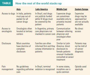 In fact, most foreign healthcare models follow that same structure: Government-funded schemes supported by private provisions, said Harris W. Dalrymple, PhD, director of project management for Pharmaceutical Product Development, a contract research organization. In Western Europe, except for France, most countries have financial limitations around oncology resources. "As you go further East, there are generally fewer treatment centers relative to the size of the population, and most countries have an established per capita allowance for care. And once that's spent, it's over," he said.