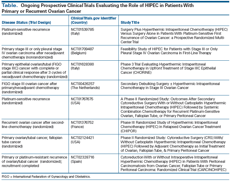 Table. Ongoing Prospective Clinical Trials Evaluating the Role of HIPEC in Patients With Primary or Recurrent Ovarian Cancer