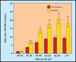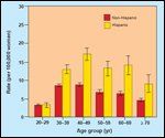 Analyses of invasive cervical cancer incidences by age and stage at diagnosis indicated that, except for women aged 20 to 29 years, incidences for Hispanic women were significantly higher than for non-Hispanic women, regardless of stage at diagnosis (Figures 1 and 2). For both Hispanic and non-Hispanic women, approximately 30% of all new invasive cervical cancers diagnosed among women aged < 50 years were at an advanced stage; among women who were aged ≥ 50 years, advancedstage cervical cancer represented 52% of new diagnoses.
