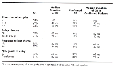 A total of 42% of patients had received one to three prior chemotherapies and 33% of patients had received four prior chemotherapies. Baseline characteristics were as follows: 70% less than 60 years old, 56% male, 89% stage III or IV at protocol entry, 46% positive bone marrow involvement at study entry, and 32% bulky disease (> 500 g).