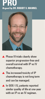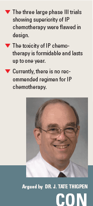 SAN FRANCISCO-The “preponderance of the evidence” supports intraperitoneal chemotherapy as the preferred treatment for small-volume residual ovarian cancer after surgical debulking, Robert S. Mannel, MD, said at a debate session of the 2008 Oncology Congress. J. Tate Thigpen, MD, who took the con side of the debate, argued that IP chemotherapy remains experimental because of flaws in the design of the three major trials of IP therapy and its “formidable toxicity.”