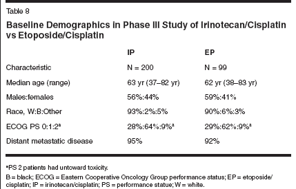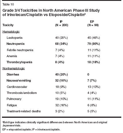 Sandler A, Langer CJ, Bunn PA, et al:Phase III study comparing irinotecan andcisplatin to cisplatin and etoposide for previouslyuntreated extensive small cell lung cancer:Interim safety analysis (abstract 280). LungCancer 41(suppl 2):S82, 2003.