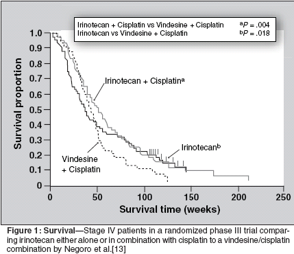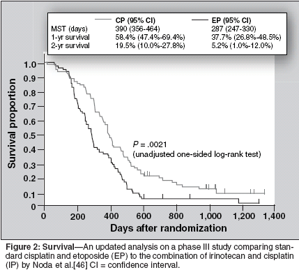 Noda K, Nishiwaki Y, Kawahara M, etal: Irinotecan plus cisplatin compared withetoposide plus cisplatin for extensive small celllung cancer. New Engl J Med 34b(2):85-91,2002.