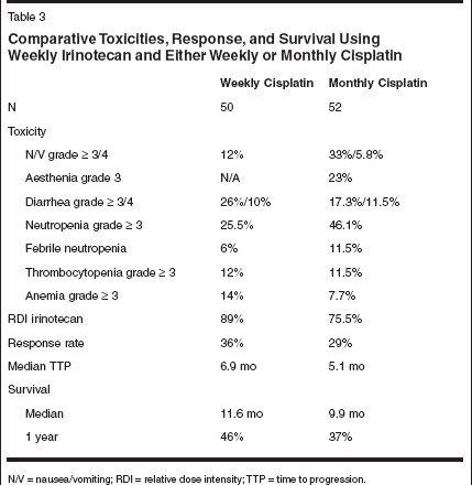 Consequently, a follow-up studymounted through Vanderbilt CancerNetwork (VCCAN) and Fox ChaseCancer Center (FCCC) combinedweekly irinotecan with weekly cisplatin.[17] There were three justificationsfor this move: (1) same-dayadministration could better exploit theputative in vitro synergy of these twoagents; (2) improved sequencing ofirinotecan and cisplatin might potentiallyimprove efficacy; and (3) decreasingthe cisplatin dose peradministration could potentially diminishtoxicity. The regimen wasmodeled after phase I data of Saltzand colleagues.[18] Eligible patientsreceived irinotecan at 65 mg/m