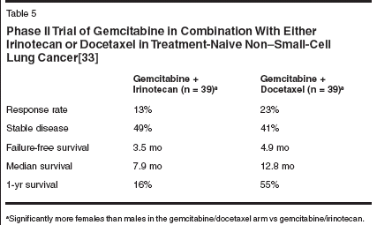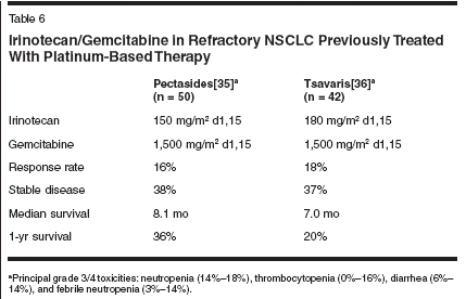 Tsavaris N, Kosmas C, Makatsoris T, etal: Bi-weekly gemcitabine and irinotecan second-line chemoterhapy in non-small cell lungcancer (NSCLC) failing prior taxane plus platinum-based regimens (abstract 2721). Proc AmSoc Clin Oncol 22:667, 2003.