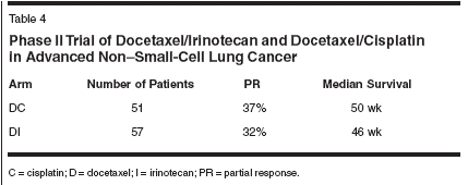 Takeda K, Yamamoto N, Negoro S, etal: Randomized phase II study of docetaxel pluscisplatin vs docetaxel plus irinotecan in advancedNSCLC: A West Japan Thoracic OncologyGroup (WJTOG) study (abstract 1944).Proc Am Soc Clin Oncol 19:497a, 2000.