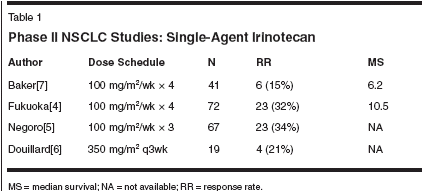 Baker L, Khan R, Lynch T, et al: Phase IIstudy of irinotecan (CPT-11) in advanced nonsmallcell lung cancer (NSCLC) (abstract1658). Proc Am Soc Clin Oncol 18:461a, 1997.
