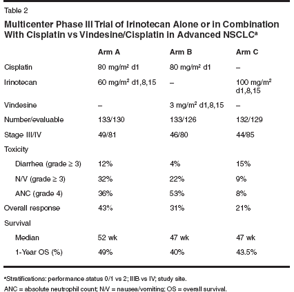 Niho S, Nagao K, Nishiwaki Y, et al: Arandomized multicenter phase III trial ofirinotecan and cisplatin vs cisplatin andvindesine in patients with advanced non-smallcell lung cancer (abstract 1897). Proc Am SocClin Oncol 18:492a, 1999.