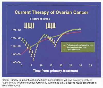 "Current treatment of ovarian cancer is graphically shown in the accompanying figure. A primary treatment such as with platinum and paclitaxel will give an early excellent response. When the disease recurs 6 to 12 months later, a second round of platinum/paclitaxel can induce a second response, but eventually all these patients die of the resistant clone, which is shown in red in the figure."