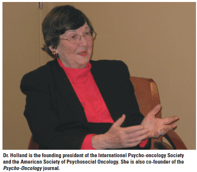 Over the years, Dr. Holland conducted some of the first epidemiologic studies of the psychological impact of cancer on patients and their families. Her work was largely responsible for putting psychosocial research on the agenda of the American Cancer Society in the early 1980s. Th e Society awarded her its Medal of Honor in 1993. She is also the founding president of the International Psycho-oncology Society (IPOS) and the American Society of Psychosocial Oncology (APOS).