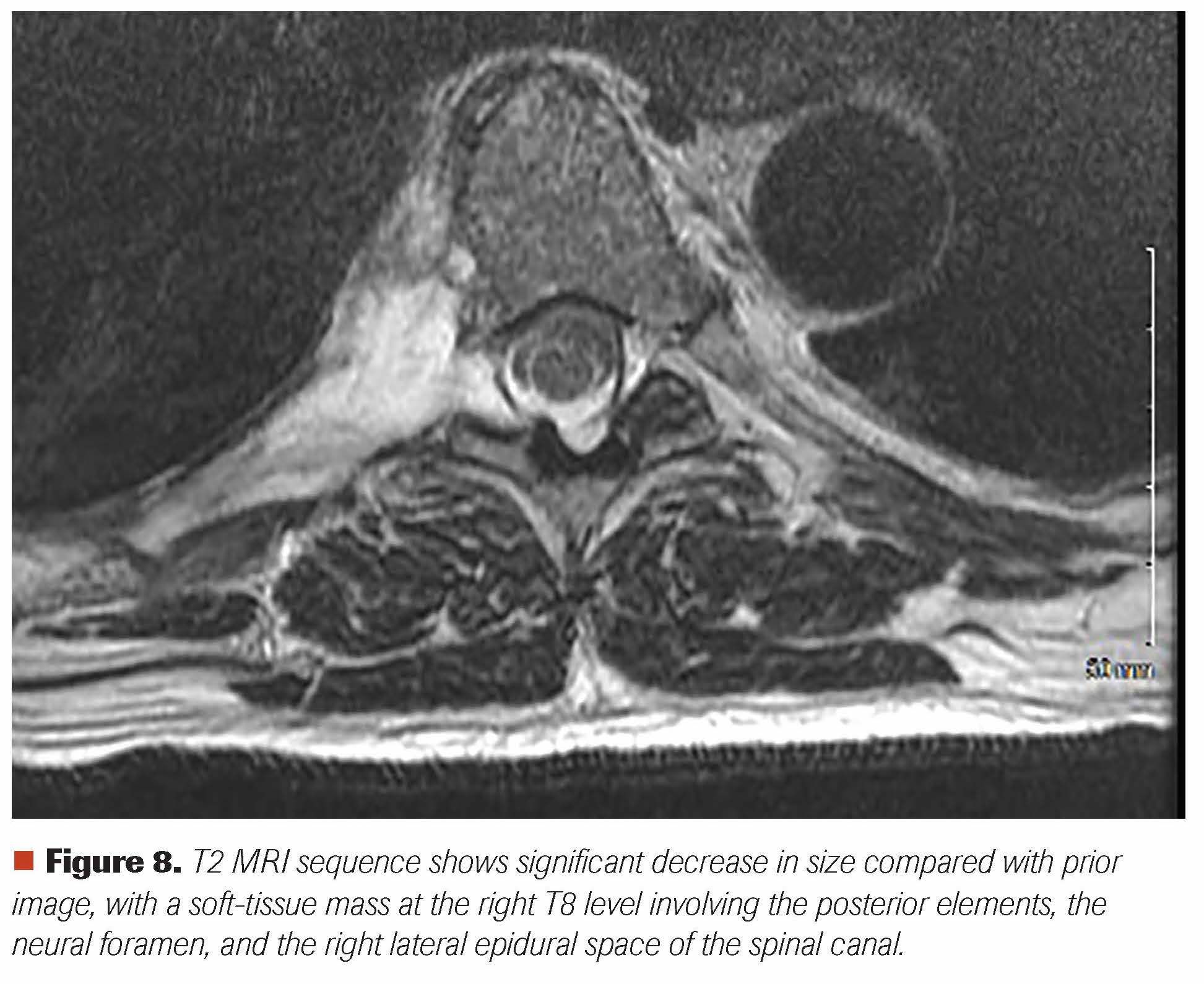 Figure 8. T2 MRI sequence shows significant decrease in size compared with prior image, with a soft-tissue mass at the right T8 level involving the posterior elements, the neural foramen, and the right lateral epidural space of the spinal canal.