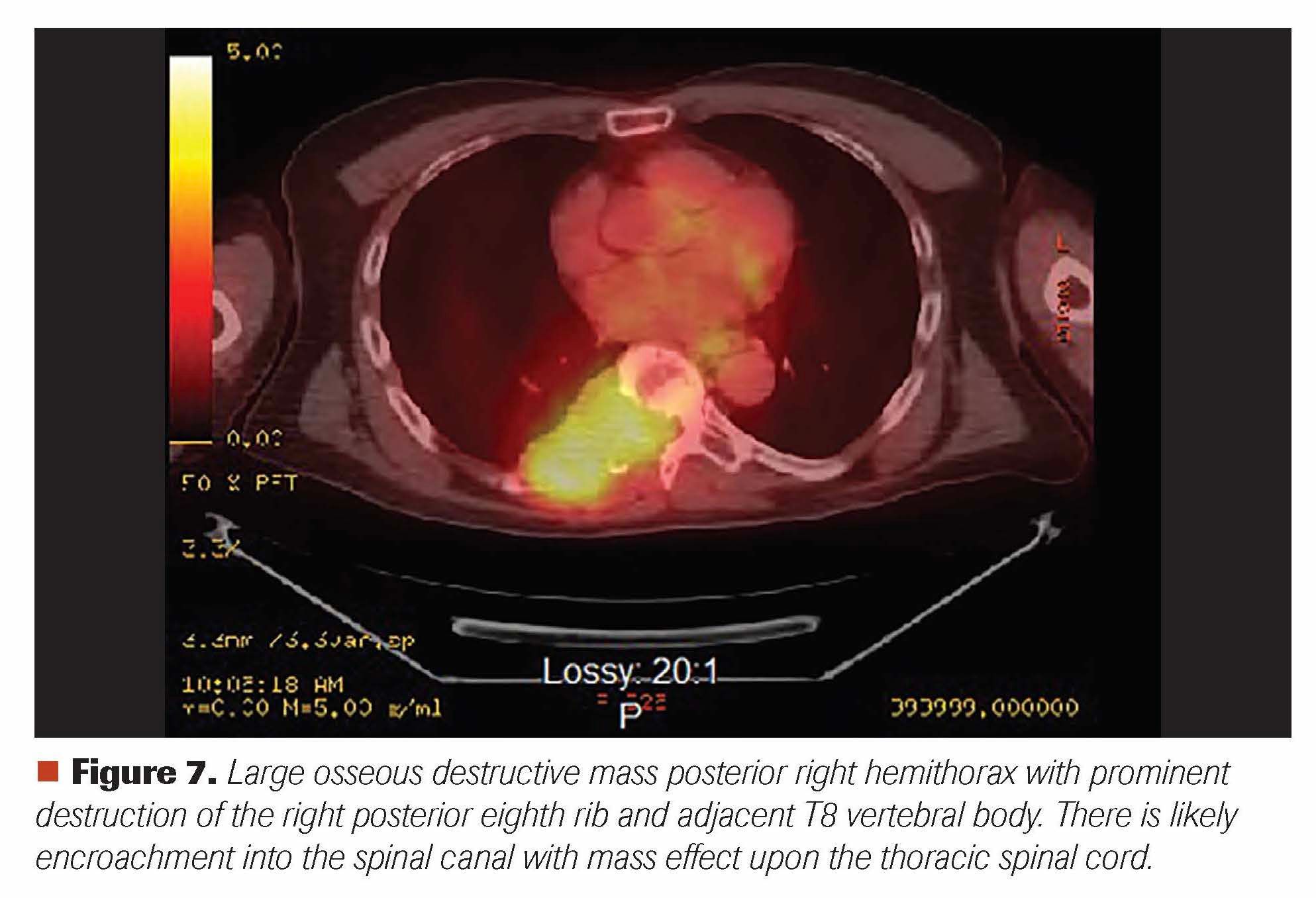 Figure 7. Large osseous destructive mass posterior right hemithorax with prominent destruction of the right posterior eighth rib and adjacent T8 vertebral body. There is likely encroachment into the spinal canal with mass effect upon the thoracic spinal cord.