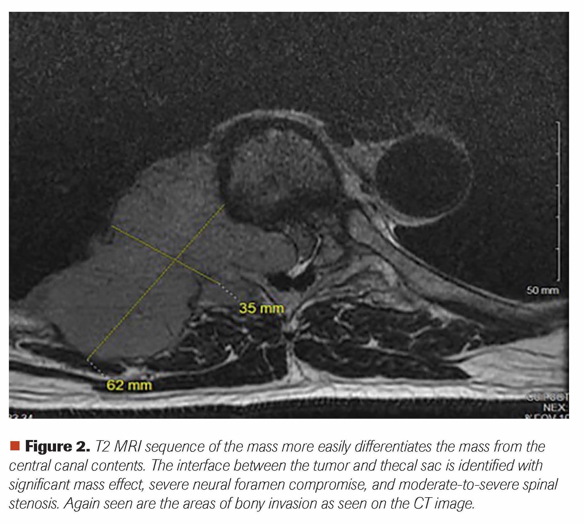 Figure 2. T2 MRI sequence of the mass more easily differentiates the mass from the central canal contents. The interface between the tumor and thecal sac is identified with significant mass effect, severe neural foramen compromise, and moderate-to-severe spinal stenosis. Again seen are the areas of bony invasion as seen on the CT image.