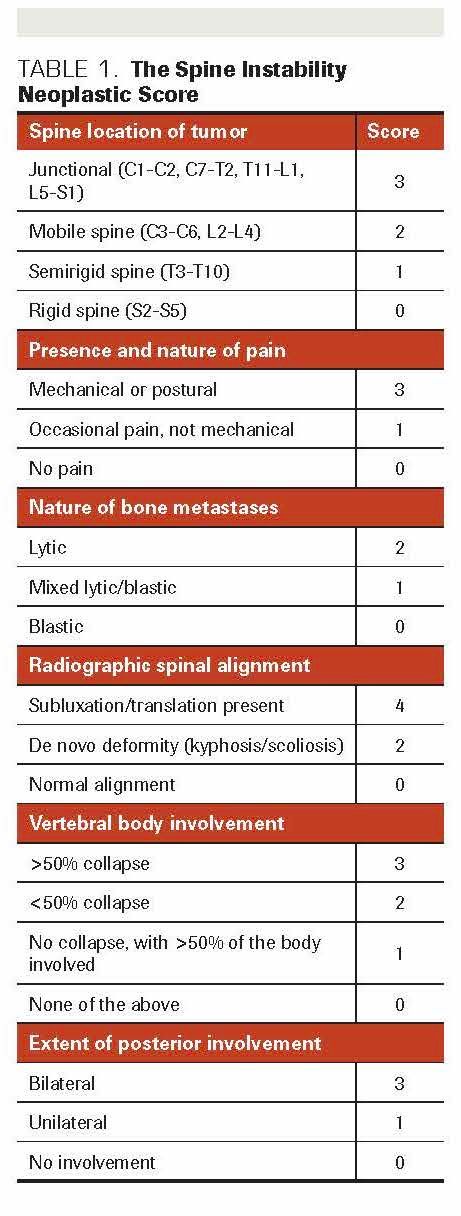 An expert opinion consensus classification system for spinal instability has been developed based on the available evidence about patient symptoms and radiographic criteria.10 This classification uses 6 individual components of spinal instability: spinal location of the tumor, presence and character of the pain, nature of bone metastases, radiographic spinal alignment, extent of vertebral body involvement, and extent of posterior spinal element involvement. All of these are scored to create a final composite Spine Instability Neoplastic Score (SINS) (Table 1).11 In guiding the operative vs nonoperative management of patients with neoplastic spinal cord compression, SINS has been shown to be useful, with very good interobserver agreement among radiologists and radiation oncologists.12,13 According to this classification system, patients with a score of 7 or higher are considered to be at risk for spinal instability. The most appropriate treatment modality for an unstable spine is stabilization either by surgery with fixation14 or by percutaneous vertebral repair.15 RT and spinal bracing have not been shown to be effective for this group of patients.16,17