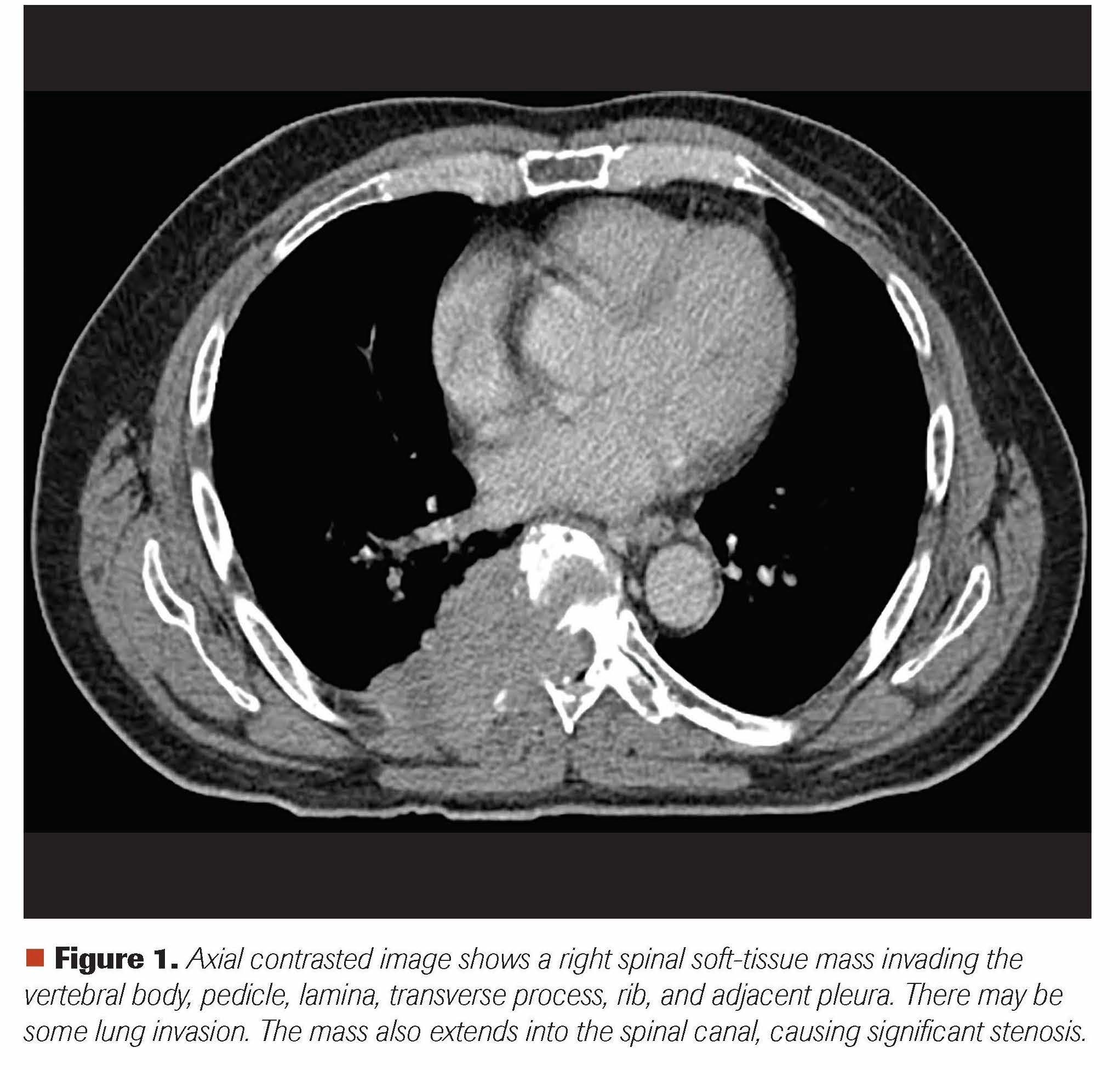 Figure 1. Axial contrasted image shows a right spinal soft-tissue mass invading the vertebral body, pedicle, lamina, transverse process, rib, and adjacent pleura. There may be some lung invasion. The mass also extends into the spinal canal, causing significant stenosis.