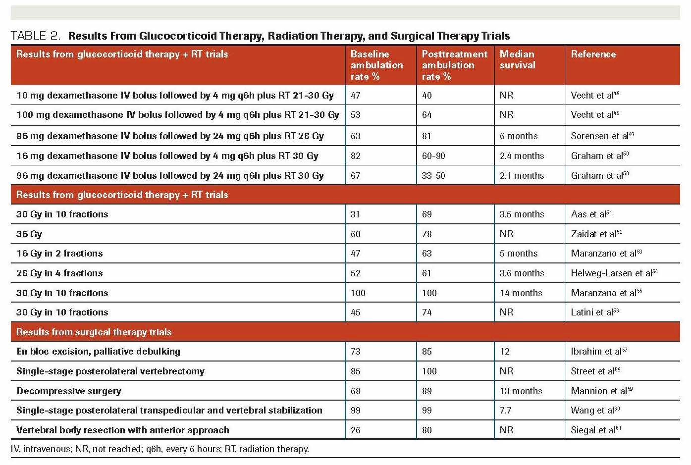 With the advances in stereotactic RT techniques, this approach has been utilized to allow precise high-dose targeting in 1 or 2 fractions while minimizing exposure to the healthy surrounding spinal cord tissue.37 A systematic review involving 59 studies with 5655 patients treated with stereotactic RT for spinal metastases showed local control rates of 80% to 90% for patients with newly diagnosed disease, 80% for postsurgical patients, and 65% for previously radiated patients.38 Results from glucocorticoid therapy, RT, and surgical therapy trials of malignant spinal cord compression are summarized in Table 2.