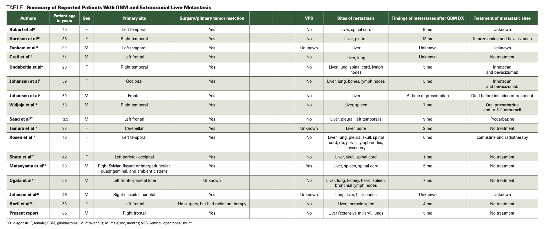 TABLE. Summary of Reported Patients With GBM and Extracranial Liver Metastasis