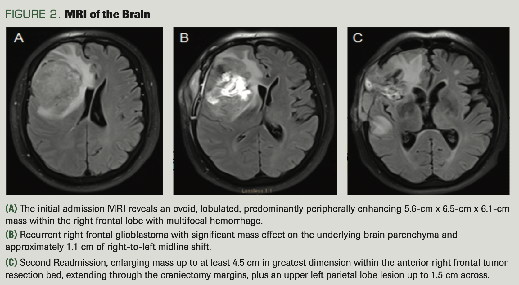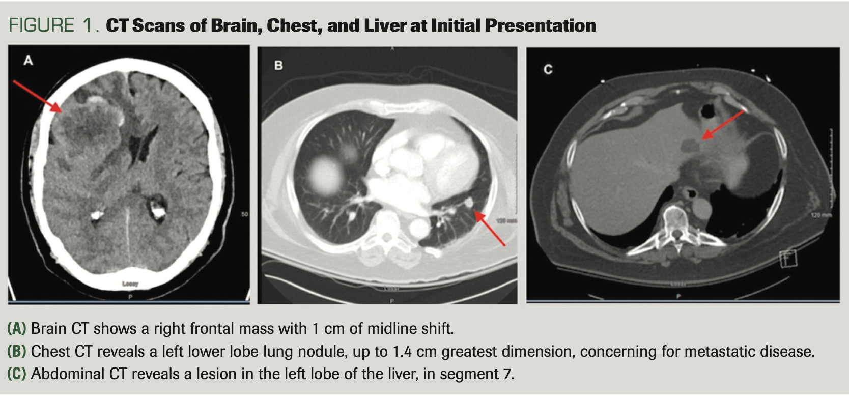 A man aged 65 years had a history of a benign lung mass (resected in 1985), papillary thyroid cancer (status post thyroidectomy performed in 2016), and a recent diagnosis of prostate cancer (Gleason grade 3+3; prostate-specific antigen [PSA] 6.25 ng/mL in 2018); he presented to an outside hospital because of progressive headache and leg weakness over the prior 2 weeks. Physical examination was normal. CT scans showed a right frontal mass with 1 cm of midline shift (Figure 1A), a 1.4-cm (greatest dimension) left lower lobe lung nodule (Figure 1B), and a 3.3-cm × 2.1-cm hypodense lesion in the left hepatic lobe (Figure 1C). He was transferred to our hospital. MRI revealed a 5.6-cm × 6.5-cm × 6.1-cm ovoid, lobulated, predominantly peripherally enhancing mass within the right frontal lobe, with multiple foci of hemorrhage (Figure 2A). The tumor was gross totally excised and was discovered to be an IDH wild-type glioblastoma that had no MGMT promoter methylation, and no mutation of ATRX. His hospital course was complicated by an acute pulmonary embolism requiring placement of an inferior vena cava filter. He was ultimately discharged to a rehabilitation facility. Subsequently, he was seen in our medical oncology clinic and scheduled for concurrent temozolomide (Temodar) and external beam radiation therapy, as per the typical Stupp regimen.10