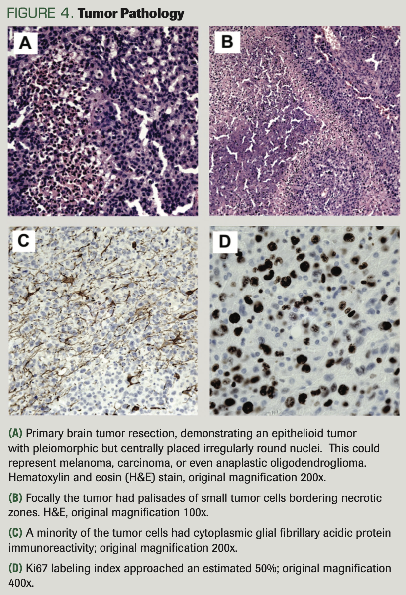 The initial resection yielded a piece of cerebral tissue measuring 7.2 cm × 5.1 cm × 1.4 cm that was mostly replaced by tumor, with extensive necrosis. The tumor had an epithelioid growth pattern with round to polygonal cells with mostly centrally placed pleiomorphic nuclei with substantial mitotic activity (Figure 4A). In a few foci, the necrosis was bordered by a palisade of small tumor cells (Figure 4B). Initially, because there was no edge in the specimen with normal brain to assess infiltrative growth, it was thought the tumor might be metastatic, but a broad panel of immunostains established that it was not carcinoma, germ cell tumor, or melanoma: Specifically, there was no immunoreactivity for cytokeratins (cytokeratin 7, cytokeratin 20, antibody CAM5.2), thyroid transcription factor 1 (TTF1), Napsin, P40, CDX2, PSA, HMB45, or MART-1/Melan-A (antibody A103). These results tended to rule out carcinomas (cytokeratins negative)—specifically, carcinomas including pulmonary non–small cell carcinomas (TTF1, Napsin, P40), gastrointestinal primary carcinomas (CDX2), prostatic carcinoma, and melanomas (HMB45, MART-1). A germ cell origin was also considered, but immunostains for Oct3/4 and alpha-fetoprotein were both negative.