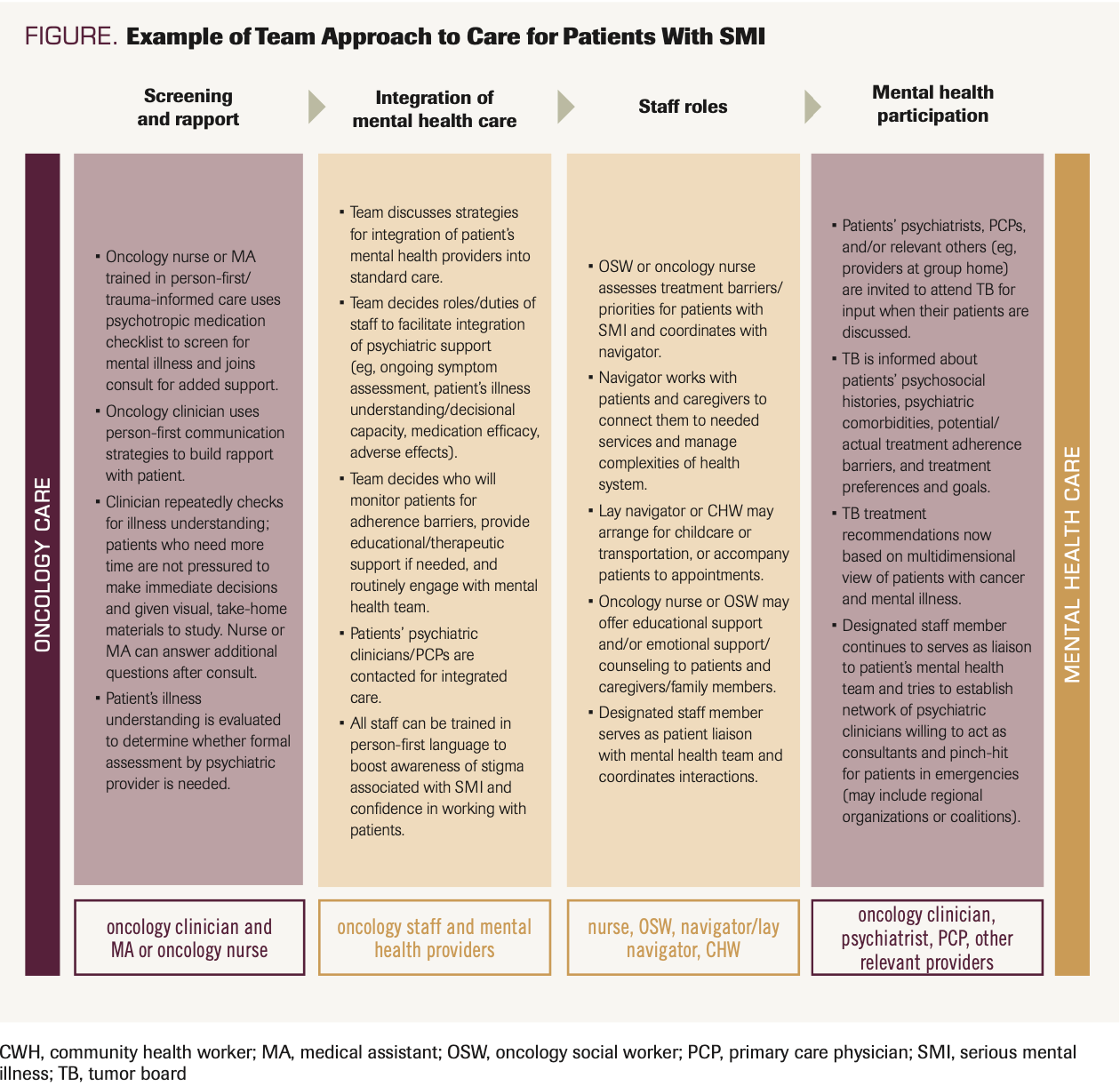 Historically, people with SMI have experienced mental health discrimination. Common misperceptions include that they are dangerous, unpredictable, uncooperative, incapable of working, and/or unable to participate in research studies.19,20 Self-stigma, the process of internalizing negative stereotypes and applying them to oneself, can also contribute to lower rates of disclosing psychiatric history and may deter help-seeking completely.21 In a meta-analysis, a majority of nonpsychiatric medical physicians believed that people with SMI were more dangerous than cohorts with less serious psychiatric diagnoses. Although these physicians were amenable to seeing patients with SMI, they worried about the amount of time required as well as potential nonadherence to treatment.7 Clinician inexperience can also contribute to delays and misdiagnoses. For example, implicit bias may occur if the clinician ascribes a patient’s physical symptoms to mental illness, which can lead to delays in specialty referrals and initiation of treatment.22 Structural discrimination, referring to discriminatory institutional policies or laws that inhibit opportunities for marginalized populations, can also curb oncology specialists’ investment in mental health training or accessing mental health services for their patients.23 Moreover, since patients with SMI have higher incidence of substance use or abuse, oncology clinicians may miss opportunities to improve cancer treatment outcomes and survivorship if they do not assess for this and refer patients to addiction experts.24