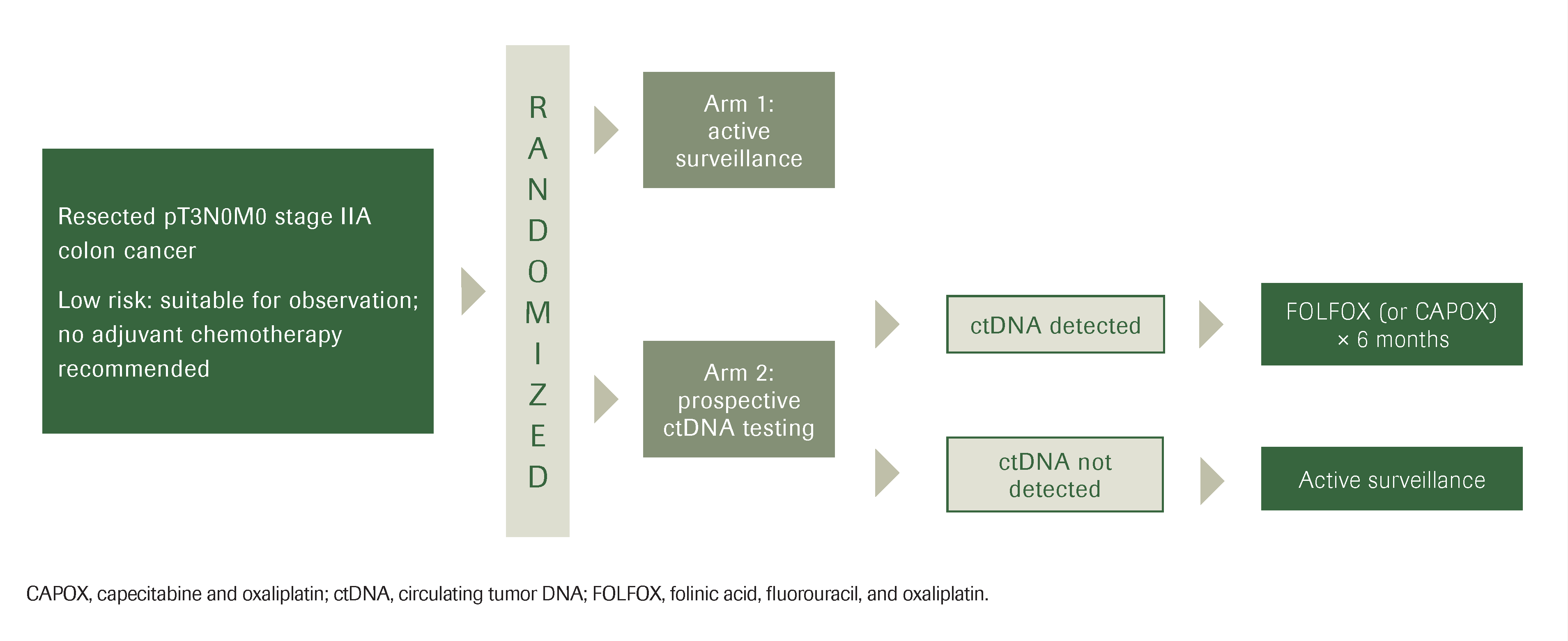 Phase 2/3 Study of Circulating Tumor DNA as a Predictive Biomarker in Adjuvant Chemotherapy in Patients With Stage IIA Colon Cancer (COBRA): a first-in-kind trial seeks to provide level 1 evidence in evaluating the role of ctDNA as a guide for clinicians in the decision to administer adjuvant chemotherapy to patients with stage IIA colon cancer (NRG GI-005) (NCT04068103).