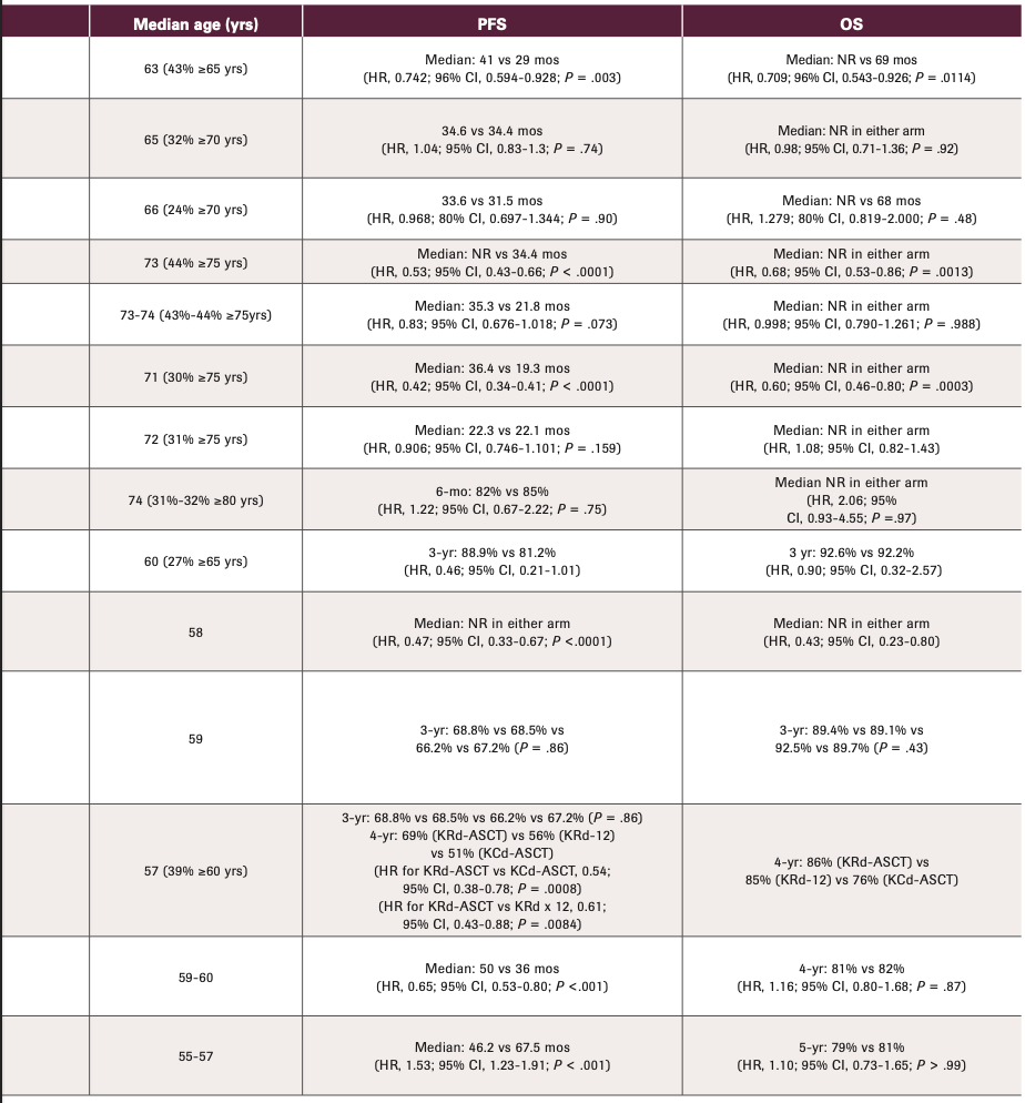 The IFM/DFCI2009 (NCT01191060) and FORTE trials demonstrated superior PFS rates for the inclusion of upfront ASCT as consolidation following RVd (IFM/DFCI2009) or KRd (FORTE) induction.38,40,41 None of these studies have demonstrated superior overall survival (OS) outcomes with inclusion of upfront ASCT, but given the increasing number of salvage therapies available and the overall trend for longer duration of survival in this patient population, it is becoming increasingly difficult to demonstrate OS benefit in the upfront setting.