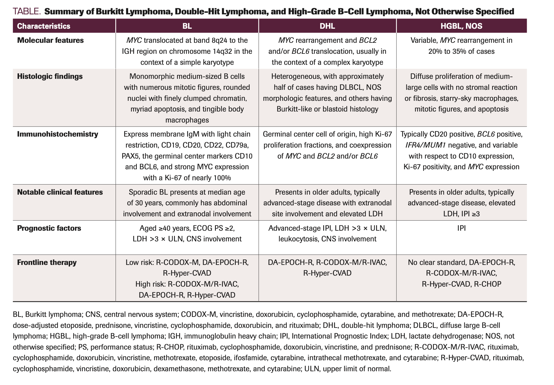 TABLE. Summary of Burkitt Lymphoma, Double-Hit Lymphoma, and High-Grade B-Cell Lymphoma, Not Otherwise Specified