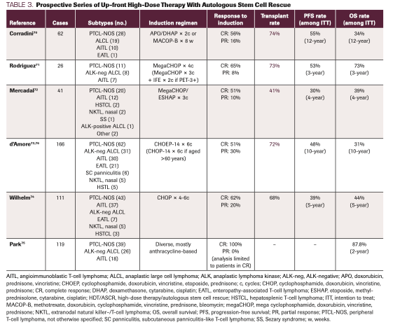 Multiple other observational series exist.70-81 Heterogeneity precludes definitive conclusions, but a somewhat consistent finding is that consolidation is most effective in patients who are more chemosensitive, as evidenced by achieving CR in the frontline setting. The most compelling example comes from the Comprehensive Oncology Measures for Peripheral T-cell Lymphoma Treatment (COMPLETE) study, a large prospective cohort study of US patients with newly diagnosed PTCL.75 This report compared outcomes among patients with PTCL-NOS, AITL, and ALK-negative sALCL in first CR (CR1) who underwent HDT/ASCR (n = 36) vs observation (n = 83). Median PFS for those who underwent HDT/ASCR was superior to those who were observed (57.6 months vs 47.5 months; P = .23), as was the estimated 2-year OS rate (87.8% vs 70.2%; P = .06), although neither difference was statistically significant. Among those with AITL, survival was notably increased in the HDT/ASCR vs non-HDT/ASCR group (2-year PFS rate, not reached vs 18.6 months; P = .10; 2-year OS rate, not reached vs 24.3 months; P <.01). For ALK-negative sALCL and PTCL-NOS, the HDT/ASCR cohorts experienced nonsignificant survival improvements. Univariate analyses showed significantly improved 2-year OS rates for those with advanced-stage disease (87.2% vs 58.4%; P = .013) and intermediate to high IPI score (87.6% vs 59.2%; P = 0.018) who underwent HDT/ASCR vs those who did not. In a multivariate analysis, HDT/ASCR was associated with superior OS with an HR of 0.37 (95% CI, 0.15-0.89; P = .03), regardless of stage or IPI.