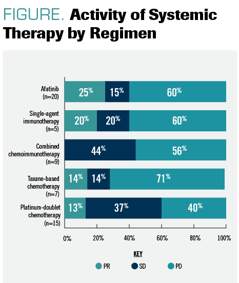 When activity of systemic therapies was evaluated among eligible patients with metastatic disease, response rates were low. Targeted therapy with afatinib induced responses in 25% of the treatment patients (5 of 20) and represented the greatest efficacy, followed by single-agent immunotherapy (20%; 1 of 5), taxane-based chemotherapy (14%; 1 of 7), platinum doublet–based chemotherapy (13%; 2 of 15), and chemoimmunotherapy (0%; 0 of 9) (FIGURE).