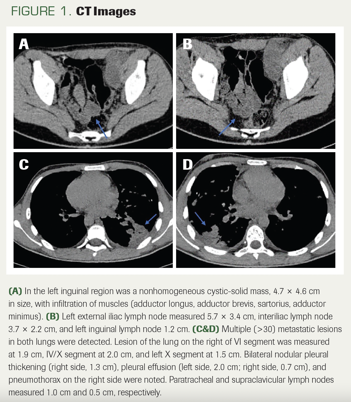 A 16-year-old boy presented with cough and dyspnea that had lasted for 1 month. He had no prior medical history, was a nonsmoker, and did not consume alcohol. Diagnostic work-up, including a CT scan, was performed. Imaging revealed an enlarged 4.6-cm inguinal lymph node, forming a very large, nonhomogeneous cystic mass measuring 15.7 cm, infiltrating several muscles: the adductor longus, adductor brevis, sartorius, and adductor minimus (Figure 1A, B). Multiple metastatic lesions in both lungs (measuring between 0.6 and 2.5 cm each) and right pleural effusion were detected (Figure 1C, D). Biopsy of the lymph node with further histology and immunohistochemistry (IHC) were performed. The tumor was described to have pleomorphic spindle malignant cells, between which there were rhabdoid cells (Figure 2). IHC stains were positive for S100, SMA, SOX10, and vimentin, and desmin was positive in rhabdomyosarcomatous elements; the loss of H3K27me3 expression in 30% of tumor cells was observed (Figure 3). The Ki67 stain demonstrated proliferative activity of 45% to 50% (Figure 3). Based on the histological and IHC examinations, malignant triton tumor (MTT) was diagnosed.