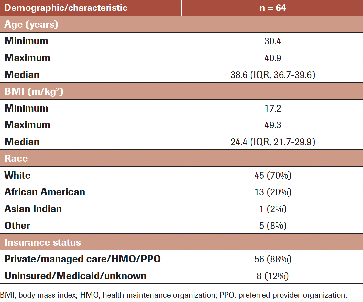 In our institutional cancer database, a total of 541 patients 40 years or younger got a diagnosis of breast cancer from 2014 to 2019. Of these young women, 64 (12%) sought out and participated in an IO consultation during the 5-year period. Table 1 displays demographic data regarding the patient population. Median age was 38.6 years (IQR, 36.7-39.6), and while the women in this clinic were 40 years or younger, the majority were older than 35 years (91%), and none were younger than 30 years. Median BMI was 24.4 m/kg2 (IQR, 21.7-29.9); however, we saw patients across the spectrum, from underweight to severely obese. Patients were primarily White (70%) or African American (20%).