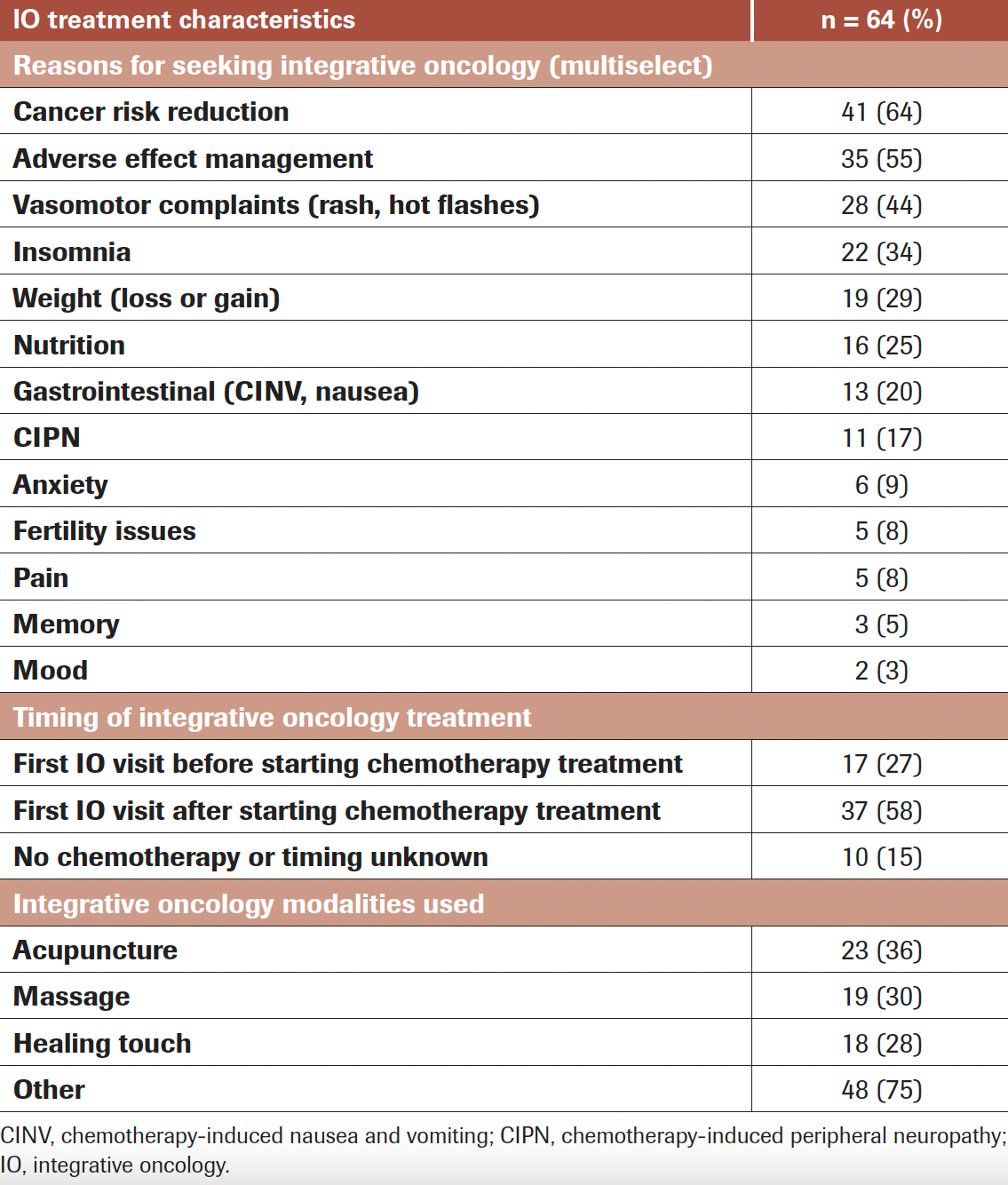 The use of integrative oncology (IO) as an adjunct to standard cancer treatment may help to reduce TRAEs, improve treatment compliance, and enhance patient well-being.16,17 As defined by the Society for Integrative Oncology (SIO), IO is “a patient-centered, evidence-informed field of cancer care that utilizes mind and body practices, natural products, and/or lifestyle modifications from different traditions alongside conventional cancer treatments. It aims to optimize health, quality of life, and clinical outcomes across the cancer care continuum and to empower people to prevent cancer and become active participants before, during, and beyond cancer treatment.”18 Small studies in patients with breast cancer suggest that integrative therapies may be of benefit;18 however, the types and timing of integrative therapies offered at cancer centers differ. Furthermore, the timing of integrative therapies and usage patterns relative to standard treatment are unknown.