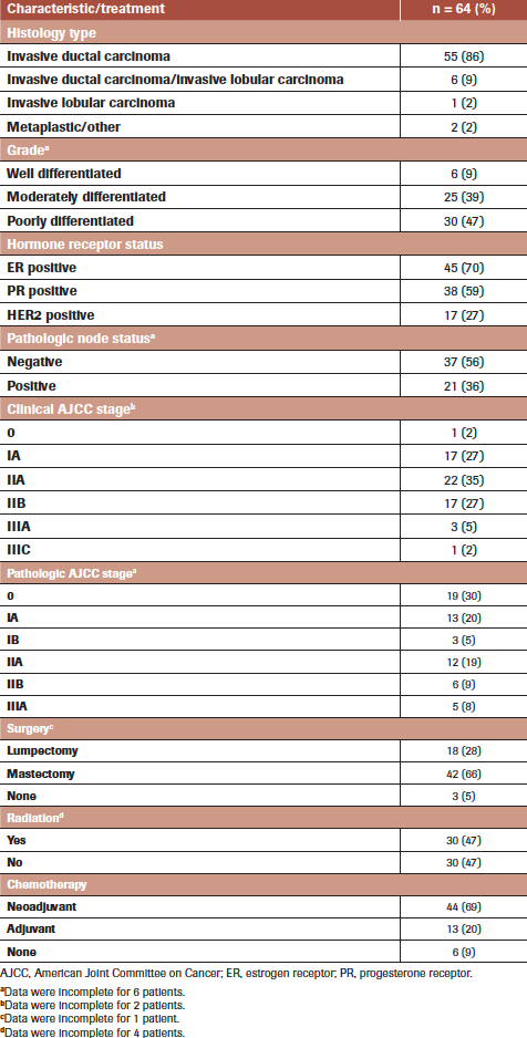Table 2 displays cancer characteristics and treatment modalities of the 64 patients examined in the study. The most common patient baseline factors at presentation were hormone receptor–positive status (estrogen receptor, 70%; progesterone receptor, 59%), poorly differentiated grade (47%), and invasive ductal carcinoma histology (86%). Node-negative (64%) disease without distal metastases was common. Clinical stages IA, IIA, and IIB were most common and almost evenly distributed (27%, 34%, and 27%, respectively), whereas only 2% of patients were clinical stage 0. In general, the pathologic stage of patients was lower than that of their clinical stage, likely due to the effects of neoadjuvant treatment. On pathologic examination, 30% of patients were pathologic stage 0, 20% stage IA, and 19% stage IIA.