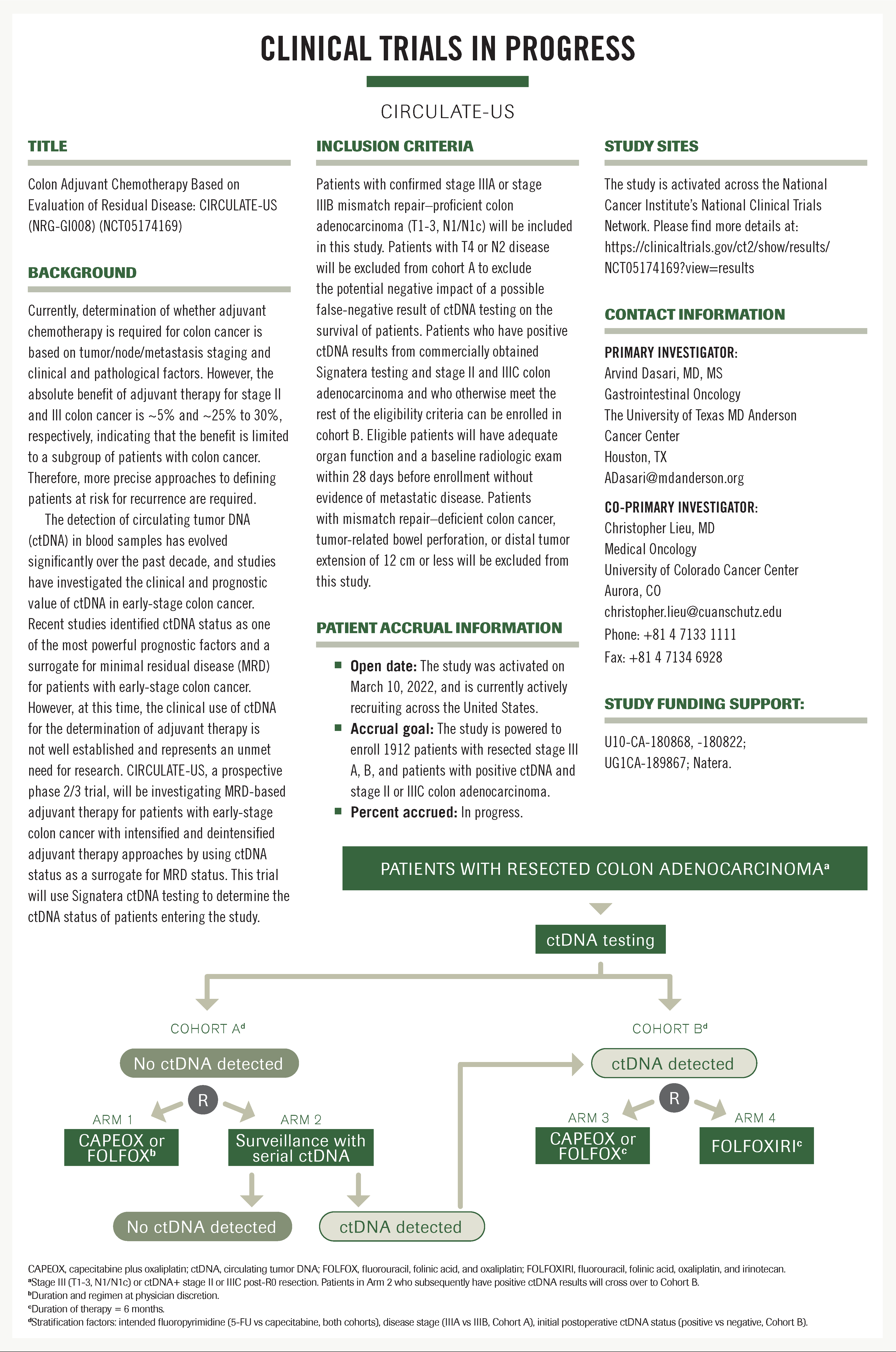 METHODS: CIRCULATE-US, a prospective phase 2/3 randomized trial, is investigating the molecular dynamics and prognostic role of ctDNA (evaluated by Natera’s Signatera assay) for patients with resected colon cancer. Patients with negative postoperative ctDNA will be enrolled in cohort A and randomized to receive either immediate treatment with 5-fluorouracil and folinic acid or capecitabine plus oxaliplatin (FOLFOX6 or CAPEOX; Arm 1) or serial ctDNA surveillance with delayed adjuvant therapy (Arm 2). Patients randomized to Arm 2 with subsequent positive ctDNA results will be enrolled in cohort B for a second randomization to receive either FOLFOX6/CAPEOX (Arm 3) or 5-fluorouracil, folinic acid, oxaliplatin, and irinotecan (FOLFIRINOX; Arm 4) for 6 months. Patients with positive postoperative ctDNA results will be directly enrolled in cohort B and randomized to receive either FOLFOX6/CAPEOX (Arm 3) or FOLFIRINOX (Arm 4). Patients with stage II or stage IIIC colon cancer with positive ctDNA results (tested as standard of care with commercial testing) will be eligible for enrollment in cohort B. The primary end point for cohort A is time to positive ctDNA status for phase 2 and disease-free survival for phase 3 with a noninferiority design. The primary end point for cohort B is disease-free survival for both phase 2 and phase 3 with a superiority design.