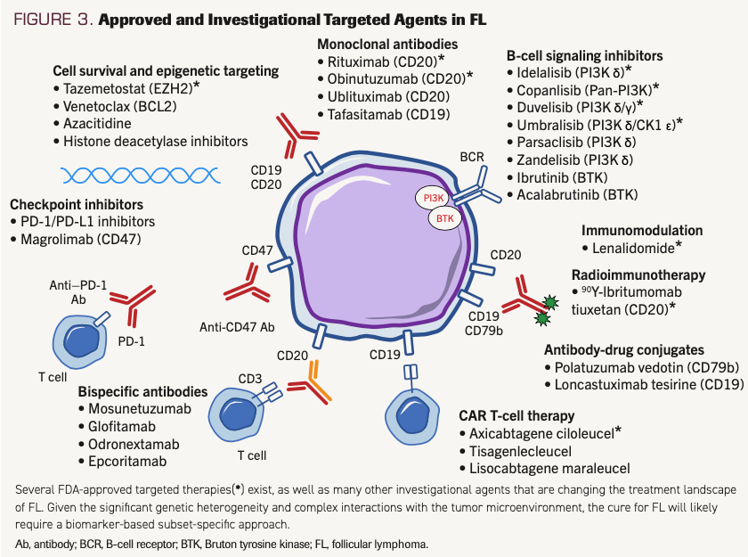 FIGURE 3. Approved and Investigational Targeted Agents in FL (originally appears in Cahill et al. ONCOLOGY (Williston Park). 2021.)