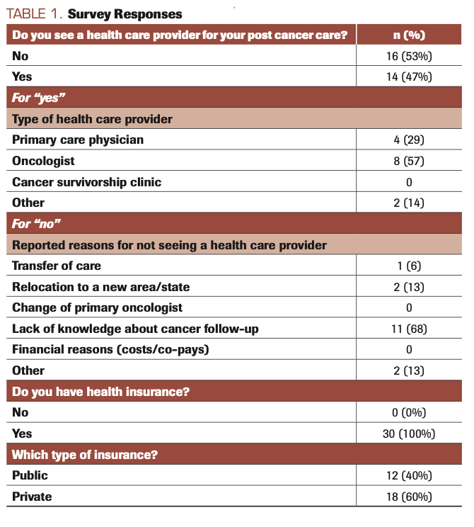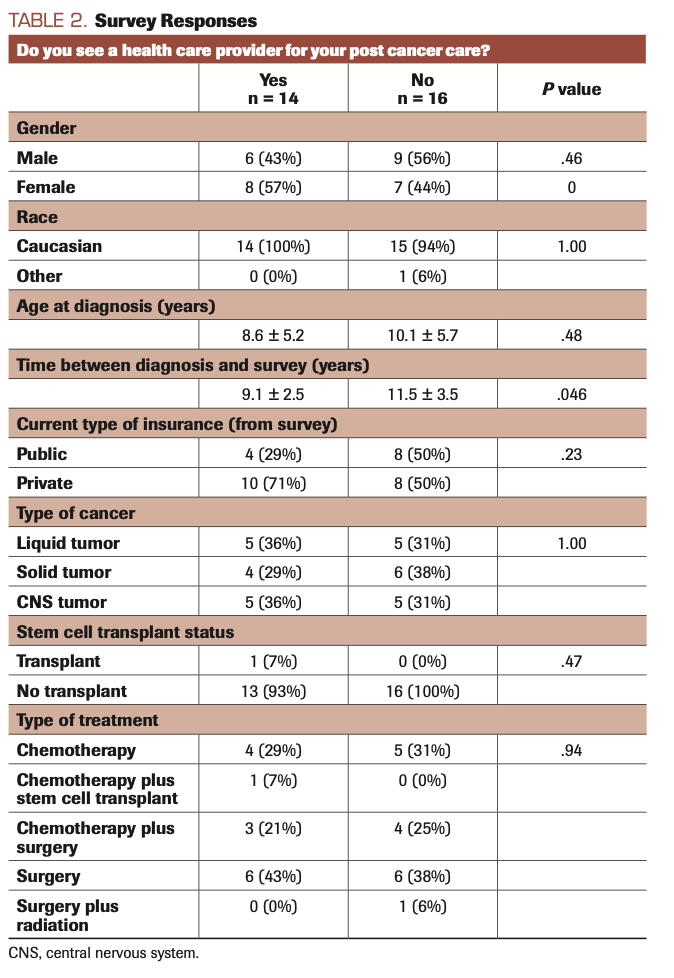 In our surveyed CCSs, approximately half the respondents (16 patients [53%]) reported not seeing a health care provider for survivorship care. This follow-up rate, although suboptimal, is similar to that reported in a survivorship study performed at Texas Children’s Cancer Center (55%) and higher than results reported in several large, multi-institutional CCS studies.12-14 In the Swiss CCS study, only 19% of respondents reported regular follow-up,13 whereas in the North American CCS study, only 31.5% of participants reported receiving survivorship care.14 However, at St. Jude Children’s Research Hospital, only 15% of CCSs were classified as nonattenders.15 At the Children’s Hospital of Philadelphia, approximately 25% of CCSs reported not receiving survivorship care within 5 years of diagnosis.16 Both these institutions have a high ranking for CCS support and have numerous interventions in place to promote continued survivorship care.