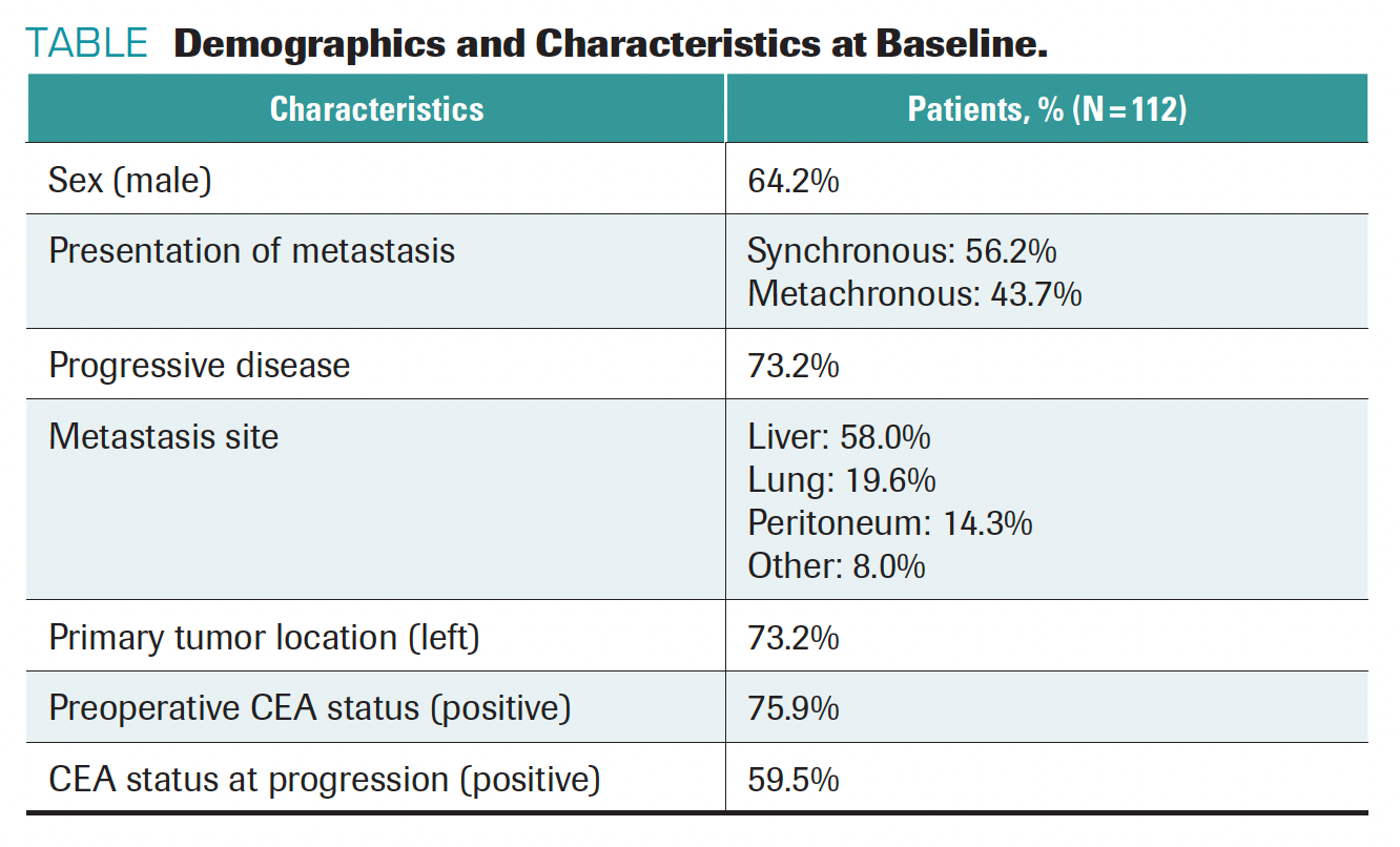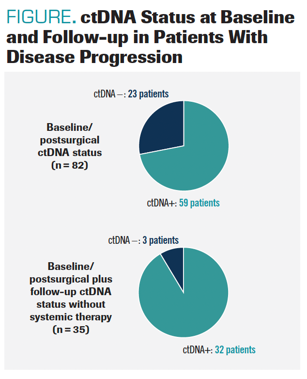 A total of 112 patients with metastatic CRC who underwent metastatic resection were enrolled, with ctDNA drawn after surgery and at the time of radiologic evidence of progressive disease or last follow-up. In total, 82 patients experienced disease progression.