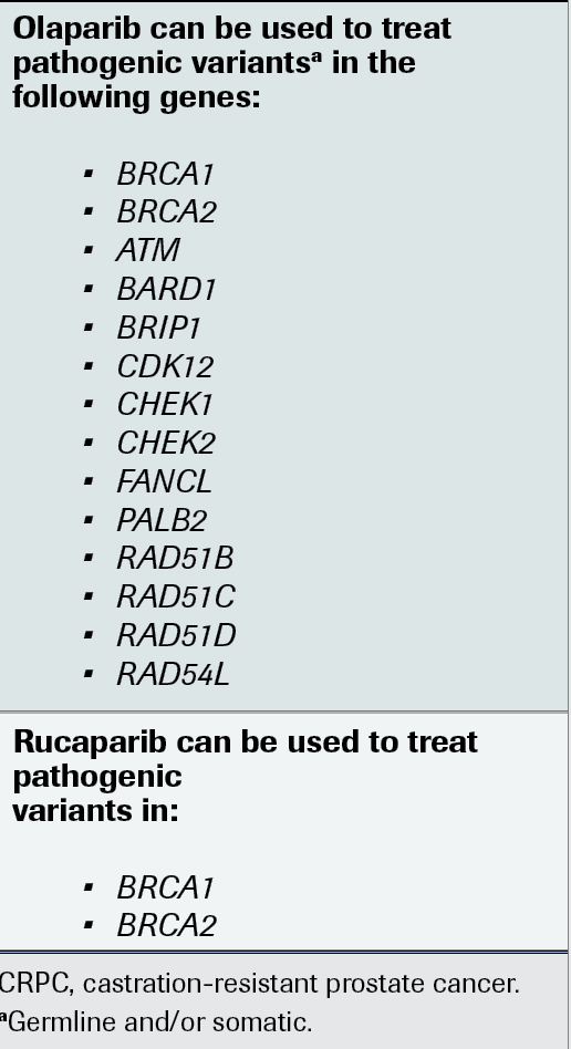 Sartor said testing for HRR genes such as BRCA1/2 and others like ATM, CHEK2, and PALB2 in metastatic castration-resistant prostate cancer (CRPC) can assist clinicians in identifying patients who may be candidates for treatment with the PARP inhibitors olaparib (Lynparza) or rucaparib (Rubraca).