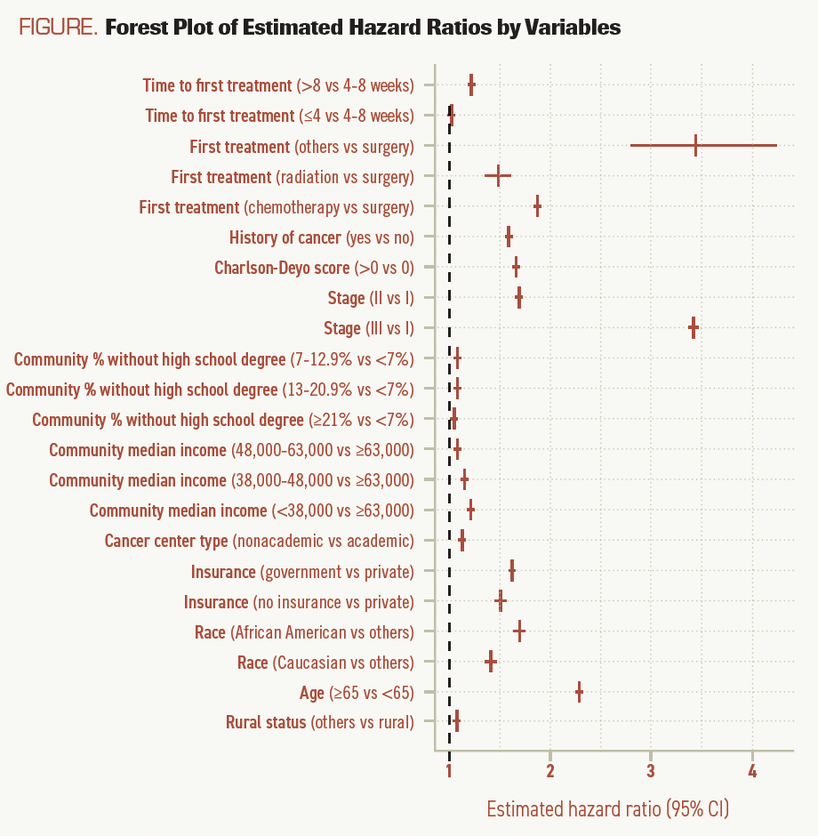 METHODS. Women with stage I to III breast cancer diagnosed between 2004 and 2012 in facilities accredited by the National Cancer Database of Commission on Cancer (CoC) were included. Differences between rural and nonrural patients in demographics, disease and treatment characteristics, socioeconomic factors, and TTI were assessed by χ2 test. The effects on OS of age, insurance status, cancer center type, community median income, percentage of the community who had not graduated from high school, and TTI were assessed using Cox models.