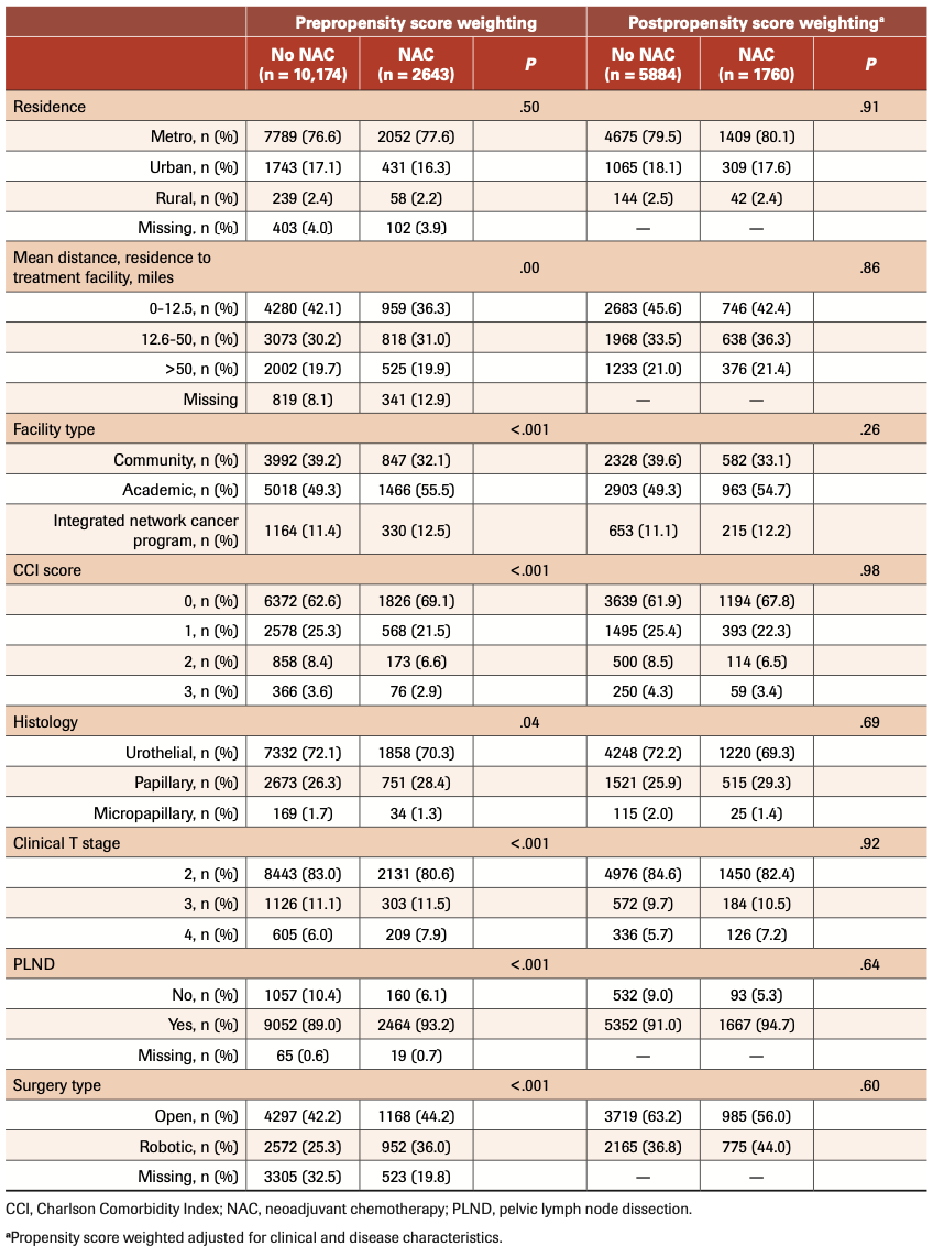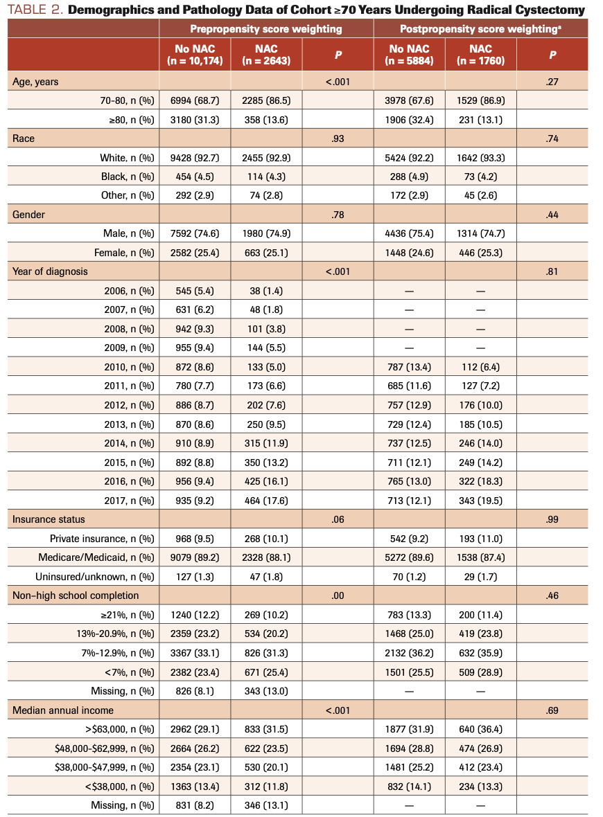 Subsequent analysis was focused on patients 70 years or older who underwent RC (n = 12,817). Of these patients, only 2643 (20.6%) received NAC. Patients receiving NAC were more likely to be aged 70 to 80 years (86.5% vs 68.7%; P <.001). NAC was associated with higher median income and high school completion rate, CCI score of 0, higher clinical T stage, and treatment at an academic center or integrated network cancer program. Furthermore, PLND and robotic surgery were more common in the NAC cohort (93.2% vs 89.0%; P <.001; and 36.0% vs 25.3%; P <.001, respectively). (Table 2)