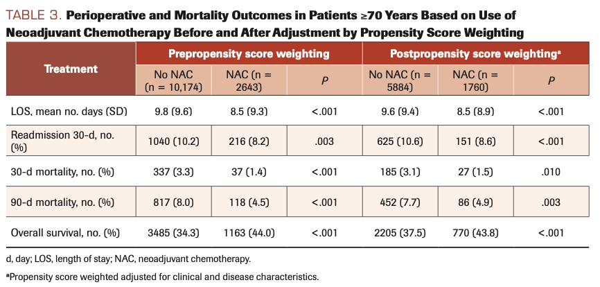 TABLE 3. Perioperative and Mortality Outcomes in Patients ≥70 Years Based on Use of Neoadjuvant Chemotherapy Before and After Adjustment by Propensity Score Weighting