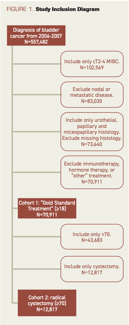 Data were extracted from the National Cancer Database (NCDB), the largest cancer registry in the world, collecting data from more than 1500 Commission on Cancer (CoC)–accredited facilities. Approximately 30% of United States hospitals have CoC accreditation and as such, the NCDB provides an excellent resource to study real-world population-based trends and outcomes.11 Patients diagnosed with MIBC from 2006 to 2017 were identified. This time frame was chosen to allow time for infiltration into clinical practice of the key Grossman et al study, published in 2003.3 Furthermore, sequencing of systemic treatment and surgical procedures was added as a data point to the NCDB in 2006, allowing for identification of the neoadjuvant nature of administered chemotherapy.
