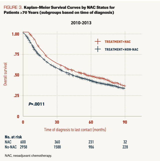 FIGURE 3. Kaplan-Meier Survival Curves by NAC Status for Patients ≥70 Years (subgroups based on time of diagnosis)