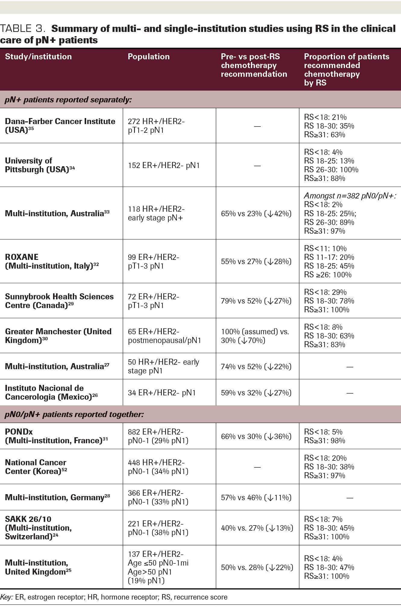 Numerous institutions across North America, Europe, Asia, and Australia have reported on their experience incorporating the use of the RS into adjuvant chemotherapy decision-making in ER+/HER2– disease (Table 3). Changes in treatment recommendations based on RS results have ranged from 11% to 42%.24-33 While many series include both pN0 and pN1 patients, recommendation changes are often greatest in the pN1 group.24,26-28,32 A multicenter Australian study of 382 patients included 118 (32%) who were pN+; of these, chemotherapy was recommended in 65% pre-RS versus 23% post RS. In the overall cohort, 98% with RS less than 18 and 78% with RS 18-30 were ultimately treated with ET alone, while 97% with RS 31 or greater received chemotherapy.33 The prospective ROXANE study included 251 pN0-1 patients from 9 centers in Italy, of whom 99 (39%) were pN1. Of these, 55% were recommended chemotherapy pre-RS versus 27% post RS; this reduction in chemotherapy use was observed exclusively in patients with RS of 17 or less.32 Similarly, in a prospective Canadian cohort of 72 pN1 patients, changes in treatment recommendation were most common for RS less than 18. In this group, 76% were recommended chemotherapy pre-RS, nearly two-thirds of whom were subsequently recommended ET alone post RS.29
