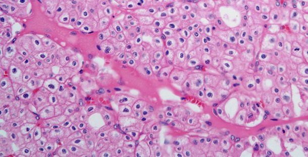 A 63-year-old man presents with a mass in the left kidney. After further evaluation, a biopsy is performed. What is your diagnosis?