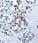 High magnification micrograph of a primary lung adenocarcinoma showing nuclear staining with a TTF-1 immunostain; source: Nephron, Wikimedia Commons