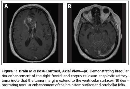 The Case:The patient is a 58-year-old woman who was diagnosed at an outside hospital with a World Health Organization (WHO) grade III non–contrast-enhancing right frontal anaplastic astrocytoma, with spread into the genu of the corpus callosum. The diagnosis was established by brain biopsy; genetic markers were not obtained. She subsequently was treated with standard chemoradiation. Approximately 4 weeks after the completion of chemoradiation, serial imaging showed new nodular rim enhancement of the right frontal tumor and new leptomeningeal enhancement of the cerebellar folia and the surface of the brainstem. Clinically, her family reported cognitive decline with waxing and waning confusion. She was restarted on dexamethasone, resulting in symptom resolution; in addition, adjuvant temozolomide was initiated. A follow-up brain MRI 1 month later showed significant improvement in the enhancement of the right frontal tumor bed, but increased leptomeningeal enhancement.