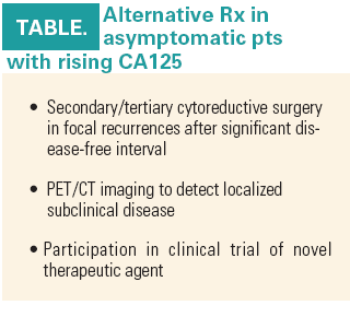 David Alberts, MD, director of the Arizona Cancer Center and an ovarian cancer specialist, agreed that climbing CA125 need not be a red flag. “Women need to know that a rising serum CA125 is an excellent biomarker of recurrent ovarian cancer, but there is no immediate urgency to start treatment if there is no symptomatology...(CA125) is not an absolute guide to the exact time point for restarting chemotherapy for recurrent disease.”
