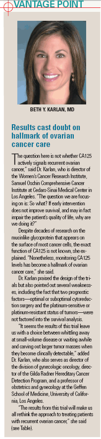 Dr. Karlan: I don’t think we should go that far. I don’t believe we should continue monitoring quarterly after normalization and completion of primary therapy in asymptomatic women who are not enrolled in a clinical trial. But we also need to consider what patients will accept. Many women often say they live from one CA125 test to the other. It took 10 years for this trial to meet its recruitment goal. Perhaps this is a reflection of women’s unwillingness to be blinded to their CA125 results.