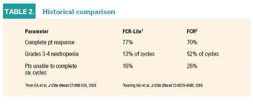 The FCR-Lite regimen turned in dramatically reduced rates of neutropenia (grade 3-4), compared with a previous study of standard FCR. Moreover, FCR-Lite can be safely administered in the community setting, according to a single-arm study of 50 patients conducted at the University of Pittsburgh (J Clin Oncol 27:498-503, 2009).